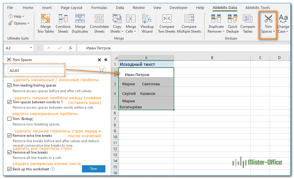 - Нажмите кнопку «Обрезать пробелы» на вкладке «Ablebits Data».