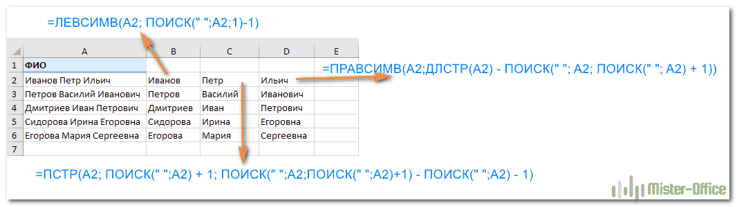 Мы используем пробел в качестве разделителя. Функция ПОИСК сообщает нам, где находится первый пробел. И затем мы «вырезаем» ровно это количество букв (минус 1, чтобы не извлекать сам пробел) слева от нашего полного имени с помощью LEFT.
