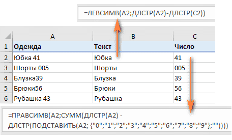 = ПРАВО (A2; СУММ (DLSTR (A2) -LSTR (ПОДСТАВИТЬ (A2; {"0"; "1"; "2"; "3"; "4"; "5"; "6"; "7" ; "8"; "9"};""))))