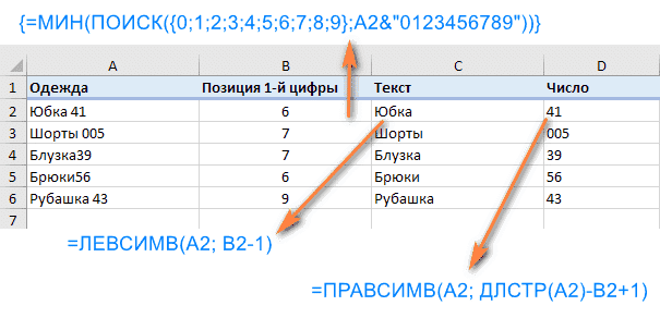 Чтобы удалить вспомогательный столбец, в котором мы вычисляли позицию первой цифры, вы можете встроить MIN в функции LEFT и RIGHT: