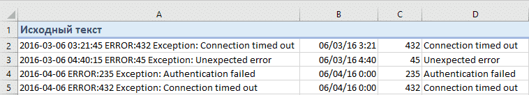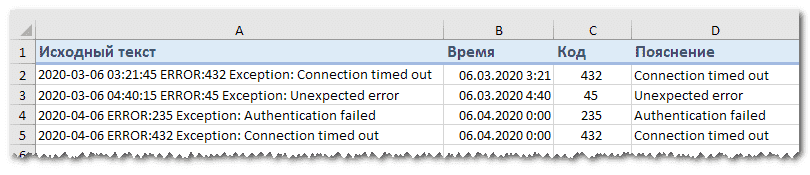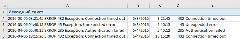 Предположим, у нас есть список строк, извлеченных из файла журнала. Ранее в этой статье мы разбили этот текст на ячейки с помощью формул. А теперь используем специальный инструмент. И вы сами решаете, какой способ удобнее и проще.