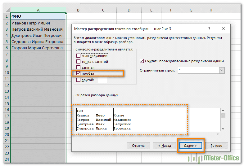 Примечание. Если ячейка может содержать несколько последовательных разделителей (например, более одного пробела в строке), установите флажок «Обрабатывать последовательные разделители как один».