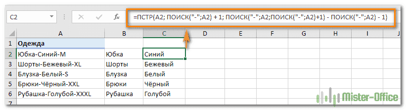 - Чтобы извлечь цвет (это все буквы между 1-м и 2-м тире), напишите C2, а затем скопируйте ниже: