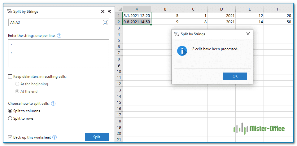 Точно так же вы можете разделить содержимое ячейки на разные ячейки в Excel с любым другим разделителем. Все, что вам нужно сделать, это заменить "-" на нужный символ, например пробел (""), косую черту ("/"), двоеточие (":"), точку с запятой (";") и т.д.