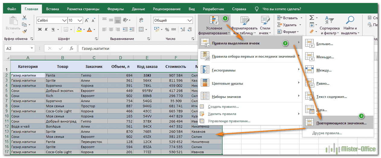 Во-первых, во всех версиях Excel есть шаблон для выделения повторяющихся ячеек. Чтобы использовать его в таблицах, выполните следующие действия: