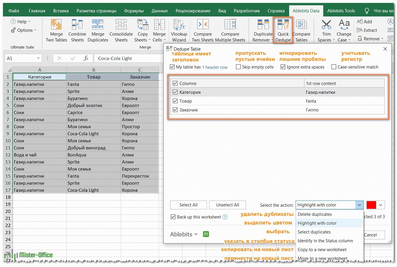 - Наконец, выберите действие, которое вы хотите выполнить с дубликатами. У вас есть несколько вариантов: выбрать, удалить, скопировать, переместить дубликаты или добавить столбец статуса для выявления дубликатов .