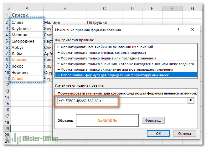 = СЧЁТЕСЛИ (A $ 2: $ A $ 11; B2) + СЧЁТЕСЛИ (B $ 2: B2; B2)> 1