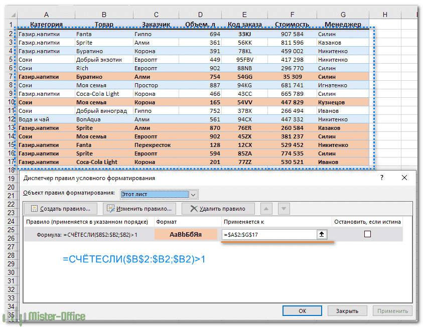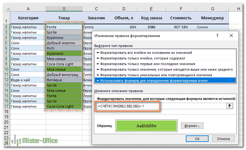 - Это работает только для одиночных ячеек. Чтобы отмечать повторяющиеся строки, вам нужно создать свои собственные правила.