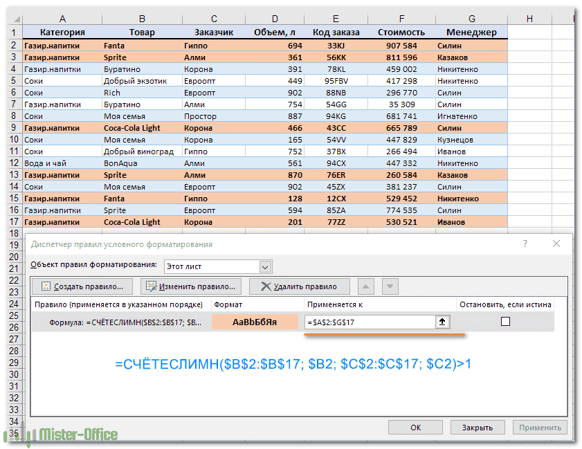 Для этого используйте функцию СЧЁТЕСЛИ, которая позволяет сравнивать по разным критериям. Например, чтобы выделить строки с одинаковыми значениями в B и C, то есть найти заказы на один и тот же продукт от одного и того же клиента, используйте одну из следующих формул: