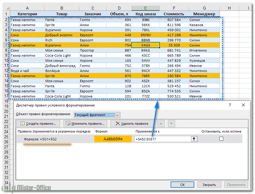 Как вы уже знаете, встроенное правило дублирования Excel работает только на уровне ячейки. Но при использовании собственных формул нет проблем с растушевкой целых линий. Ключ состоит в том, чтобы выделить целые строки, а затем создать правило с одной из следующих формул: