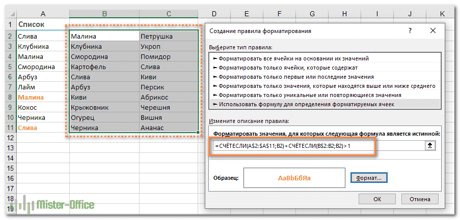 В приведенной выше формуле первая функция СЧЁТЕСЛИ подсчитывает количество вхождений данного элемента в первом столбце, а вторая функция СЧЁТЕСЛИ делает то же самое для всех последующих. Затем вы складываете эти числа и проверяете, больше ли сумма единицы.