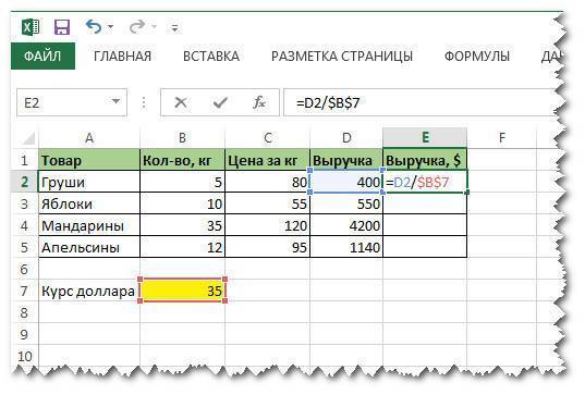 Допустим, нам нужно определить доход в долларах. Поместим его в ячейку B7. Немного поностальгируем и укажем стоимость 35 рублей за доллар. Следовательно, для определения дохода в долларах необходимо сумму в рублях разделить на курс доллара.