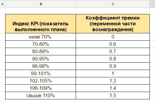- Путем сложения индексов по каждому показателю получается коэффициент эффективности (Kp), на основании которого рассчитывается премия согласно KPI.