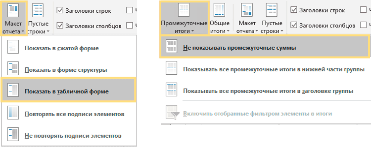 Выберите любую ячейку в таблице, перейдите на вкладку «Макет» -> «Макет отчета» -> «Показать в табличной форме». Мы получим почти нужную нам таблицу, но в ней автоматически появятся промежуточные итоги. Чтобы отключить их, перейдите к: Промежуточные итоги -> Не показывать промежуточные итоги.