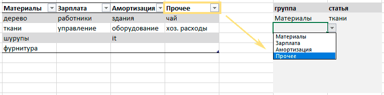 Способ 2. Связанные выпадающие списки из таблицы с группами в первом столбце и элементами — во втором