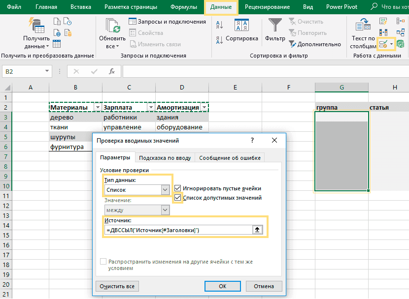- В появившемся окне выберите тип данных — Список, а в строке Источник введите формулу: =ДВССЫЛ(«Источник[«&$G3&»]»)