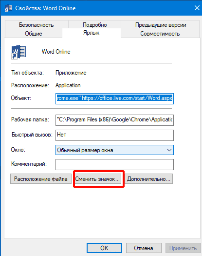 Этикетка готова. Осталось заменить изображение значка Chrome на Word. Это тоже можно исправить; для этого достаточно скачать нужную иконку с расширением .ico в интернете или отсюда и заменить иконку в свойствах ярлыка.