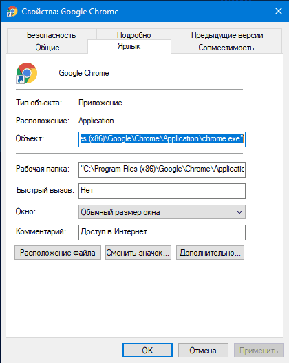 Вставьте скопированный путь в ярлык и добавьте адрес веб-страницы через пробел. Это должно выглядеть примерно так: