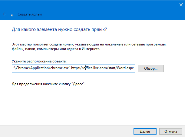 При создании ярлыка потребуется указать путь к программе, которая будет запущена. Поскольку онлайн-версии Word и Excel находятся в Интернете и доступ к ним осуществляется через интернет-браузер, необходимо указать путь к интернет-браузеру и добавить в него адрес сайта онлайн-версий MS Office.