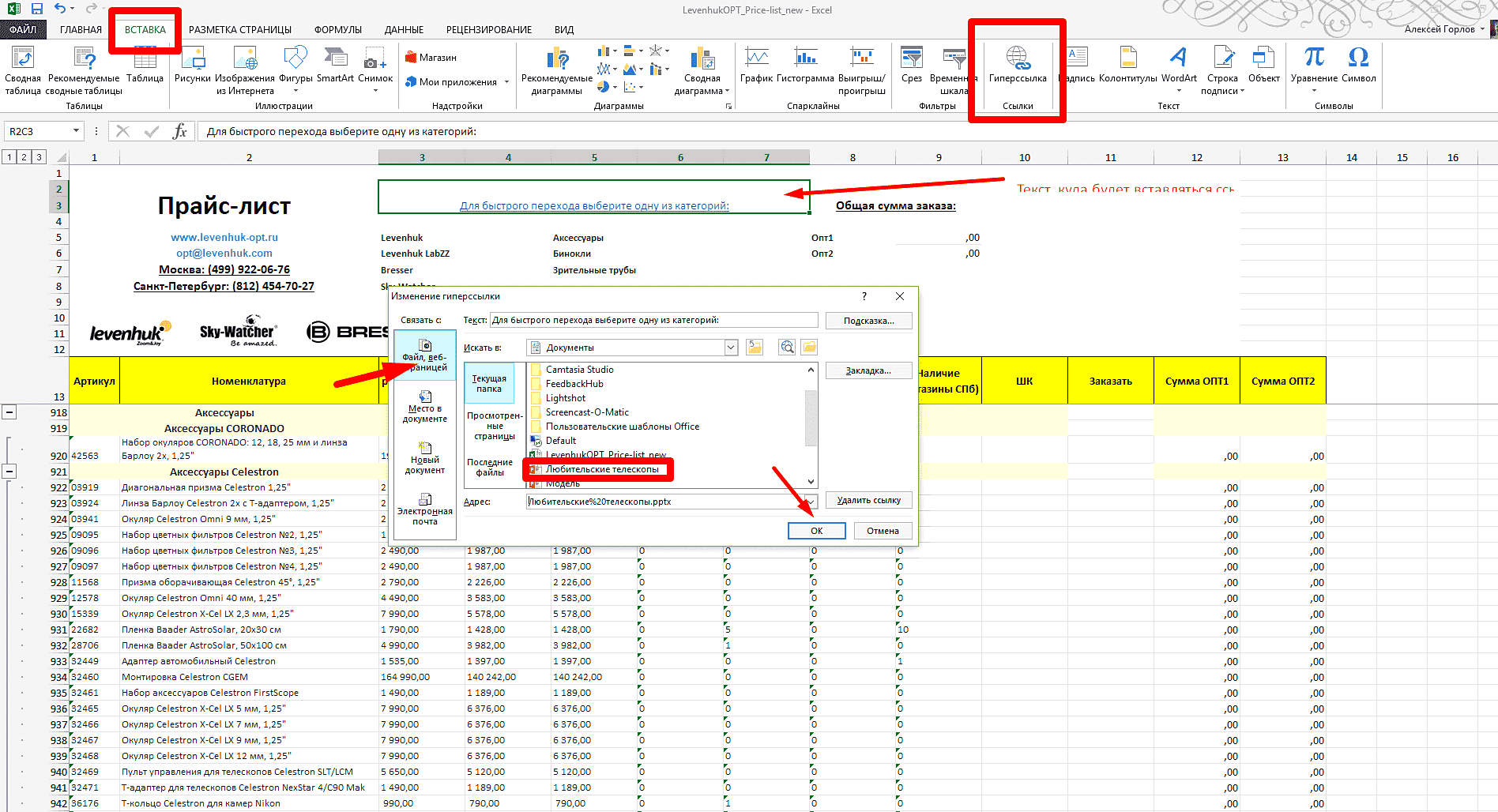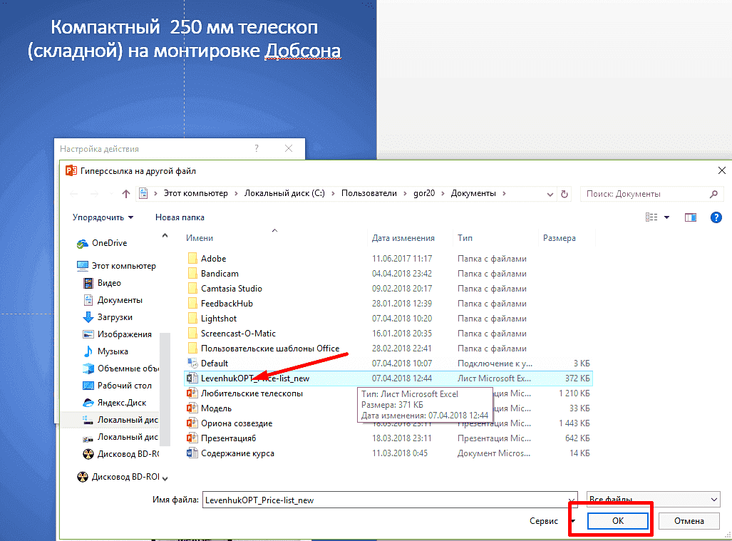 И в документе Excel мы также сделаем ссылку, но уже на нашу презентацию. Точно так же мы делаем все в документе Excel. Сначала выделите текст, который будет содержать нашу ссылку. Затем перейдите в меню «Вставка», найдите «Гиперссылка». Указываем тип ссылки (на файл) и ищем нашу презентацию в проводнике: