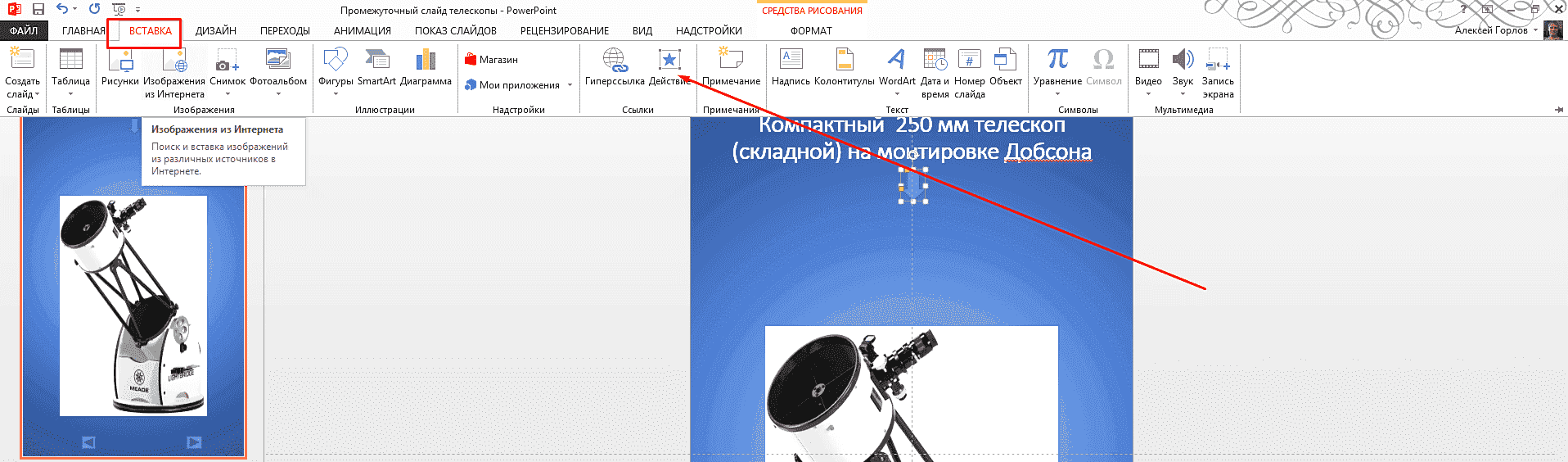 Попробуем включить в презентацию несколько документов. У меня есть прайс-лист в формате Excel. Если нужно, могу это доказать. Сначала выделю на слайде нужный объект, с которого будет переход и только потом перейду на вкладку «Вставка»: