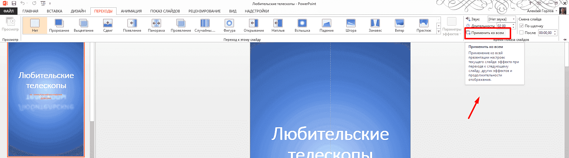Переходы по щелчку мыши и переходные изображения можно настроить для одного слайда или для всех слайдов в презентации. Чтобы эффекты перехода были одинаковыми на всех слайдах, после выполнения настроек нажмите кнопку «Применить ко всем: