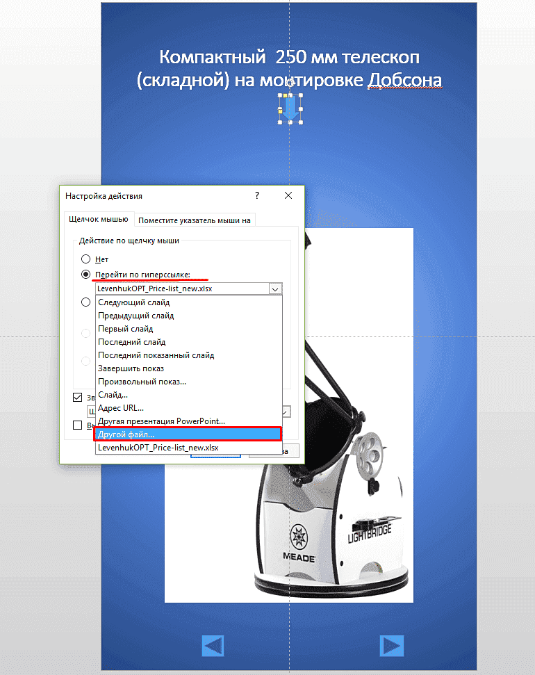 Чтобы вставить ссылку, выберите заголовок. Просто вставьте туда красивую стрелку (форму). Сделаем фон таким же, как у слайда. Итак, если я нажму на стрелку, переход будет в документ Excel. Если я просто щелкну мышью, переход будет к следующему слайду презентации. Таким образом, в процессе представительства мы получаем свободу действий. Вы можете вставить любой объект на слайд для создания гиперссылки. Далее нас интересует вкладка «Действие». Нажмите на нее и установите гиперссылку на другой файл, как на картинке: