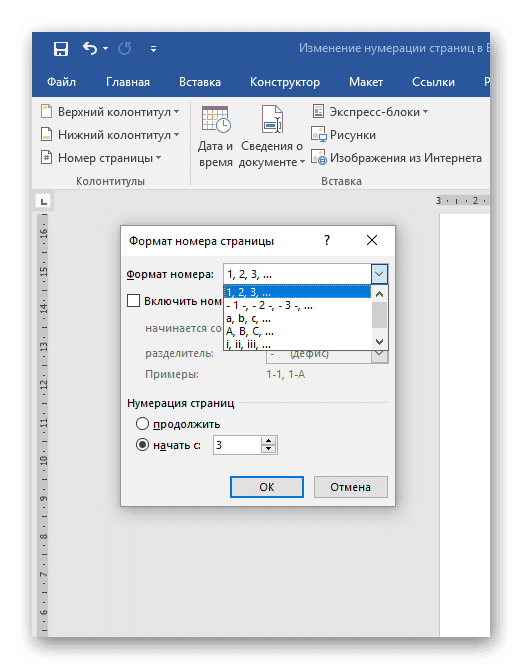 Чтобы настроить форматирование верхнего и нижнего колонтитула, выберите Форматировать номера страниц…. В этом меню вы можете установить формат номера страницы (изменить числа на буквы и т.п.), а также номер, с которого он будет выполнил нумерацию (например, если нужно начинать не с 1, а с 2).