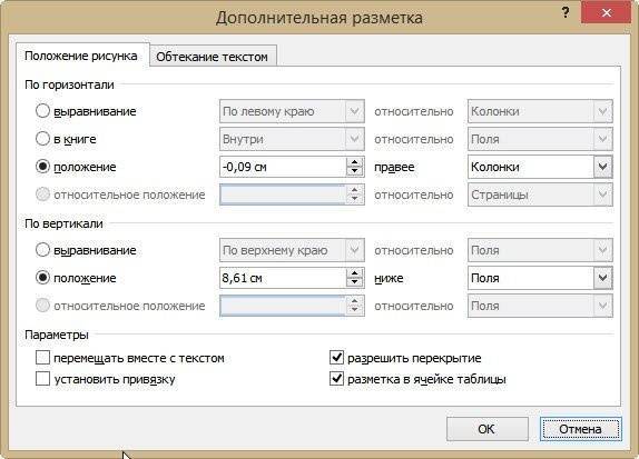 На вкладке «Положение изображения» вы можете настроить его положение по горизонтали и вертикали. Вы можете установить позицию либо относительно любого элемента (страницы, поля, абзаца, символа), либо в абсолютных единицах по отношению к любому элементу.