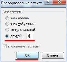 Таблица будет преобразована в текст. Указанный знак будет стоять между словами, которые были в разных ячейках. Также учитываются пустые ячейки. Понимаете, у меня в конце ряда два плюса — это бывшие пустые ячейки.