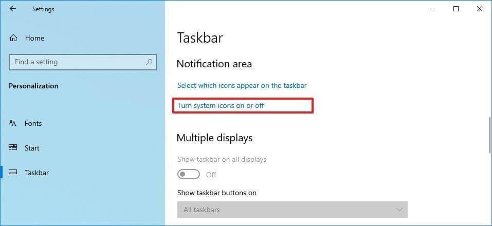 - В разделе «Область уведомлений» выберите параметр «Включить или выключить системные значки».