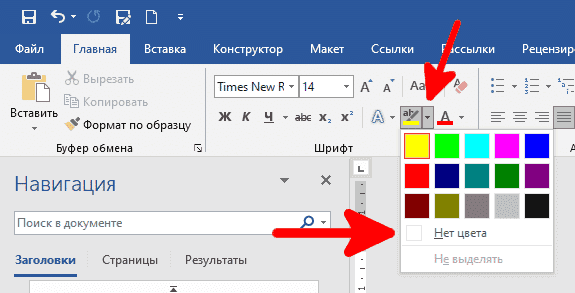 Затем щелкните значок «Цвет выделения текста» в группе «Шрифт» на вкладке «Главная» и выберите «Нет цвета» в раскрывающемся меню.