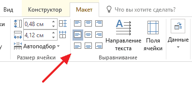 После выбора необходимых ячеек нужно перейти во вкладку «Макет». Для выравнивания текста в таблице доступен целый блок кнопок.