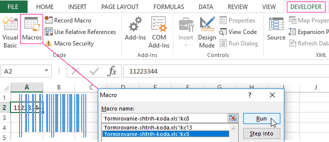 - В появившемся меню выберите макрос для создания 8-значного штрих-кода и нажмите «Выполнить”.