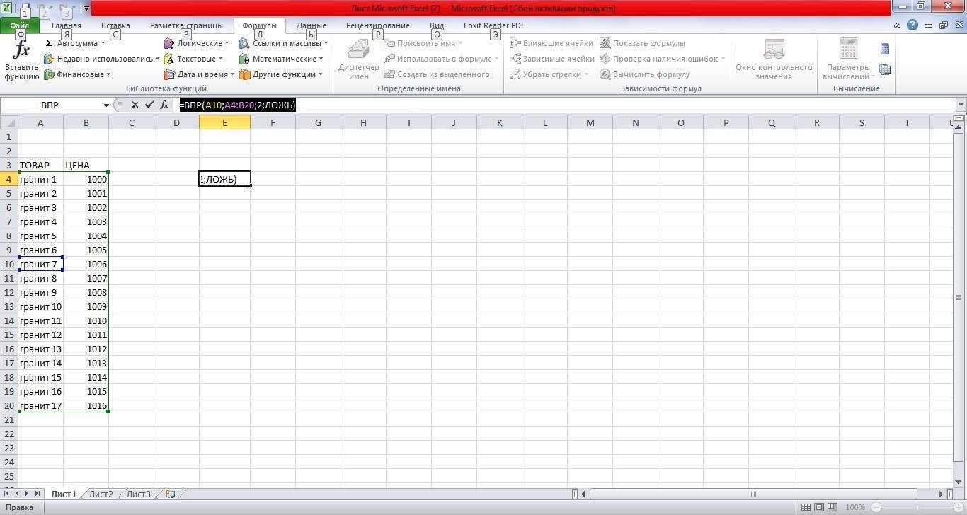 Давайте рассмотрим пример одновременного поиска нескольких значений. В таблице указаны разные цены на разные граниты. Вам нужно использовать функцию ВПР для определения цены на гранит 7.