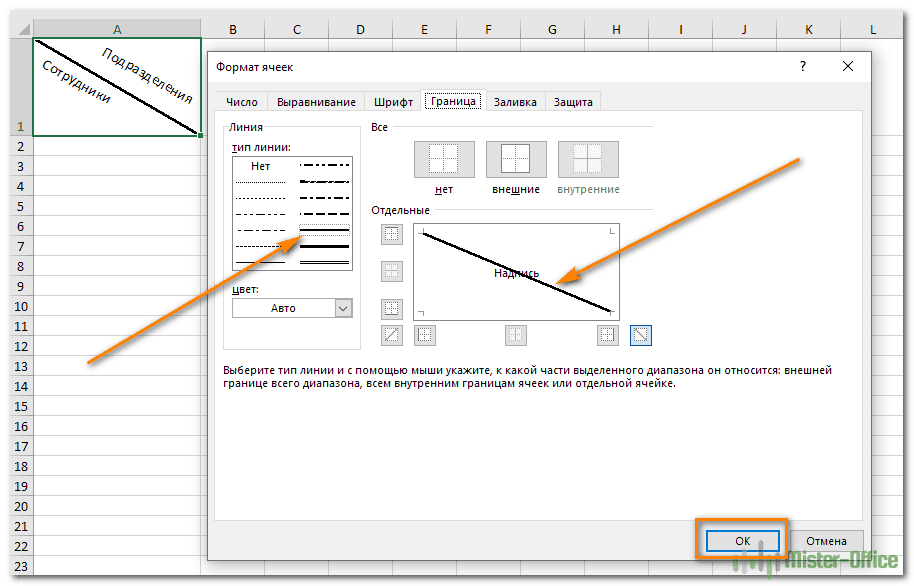 Разберем пошагово, как разбить по диагонали ячейку при помощи порматирования:
